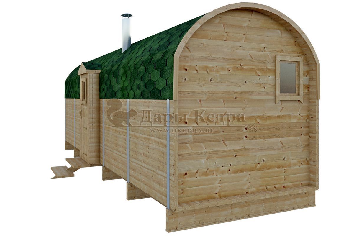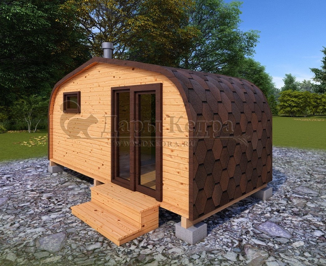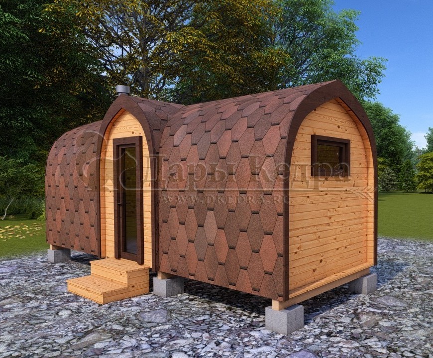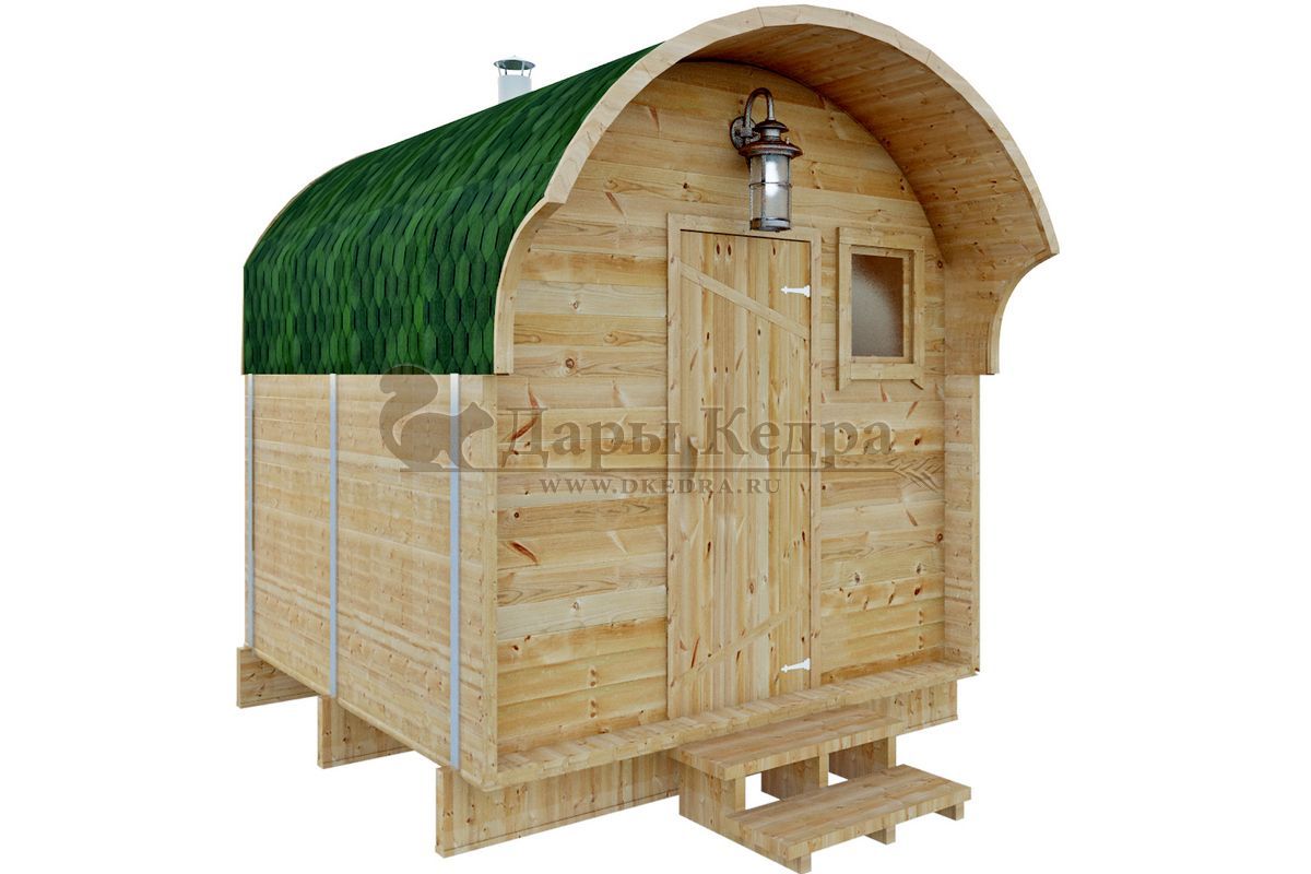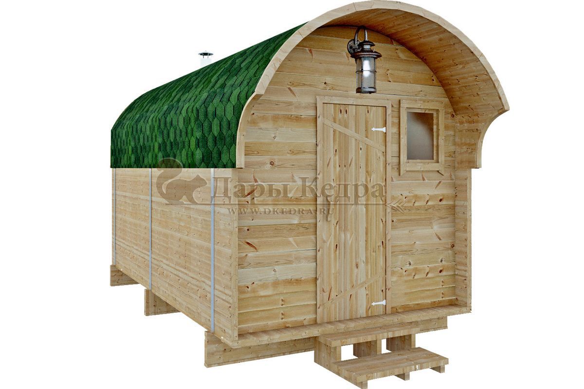 Симбиоз круглой и квадратной бани-бочки. Разработано с учётом эргономики, в ней так же просторно, как и в квадро-бочке, но при этом полукруглая крыша не дает задерживаться снегу и влаге на кровле. А еще такая баня безусловно красивая, мобильная и доступная каждому!