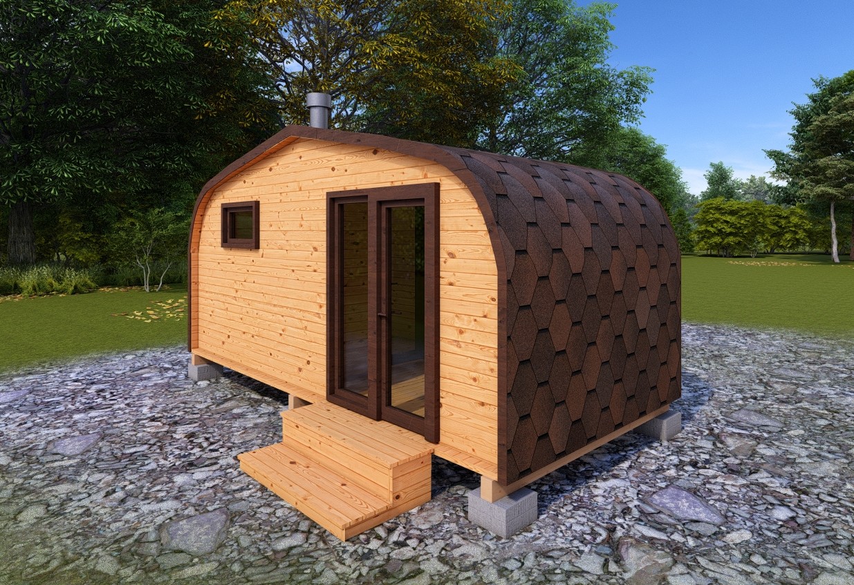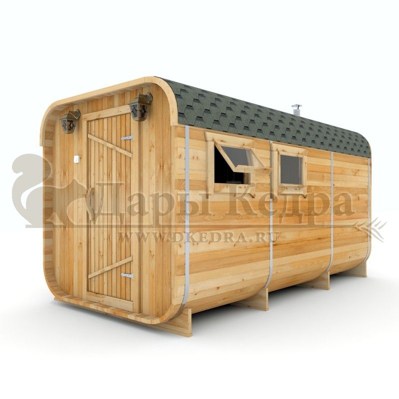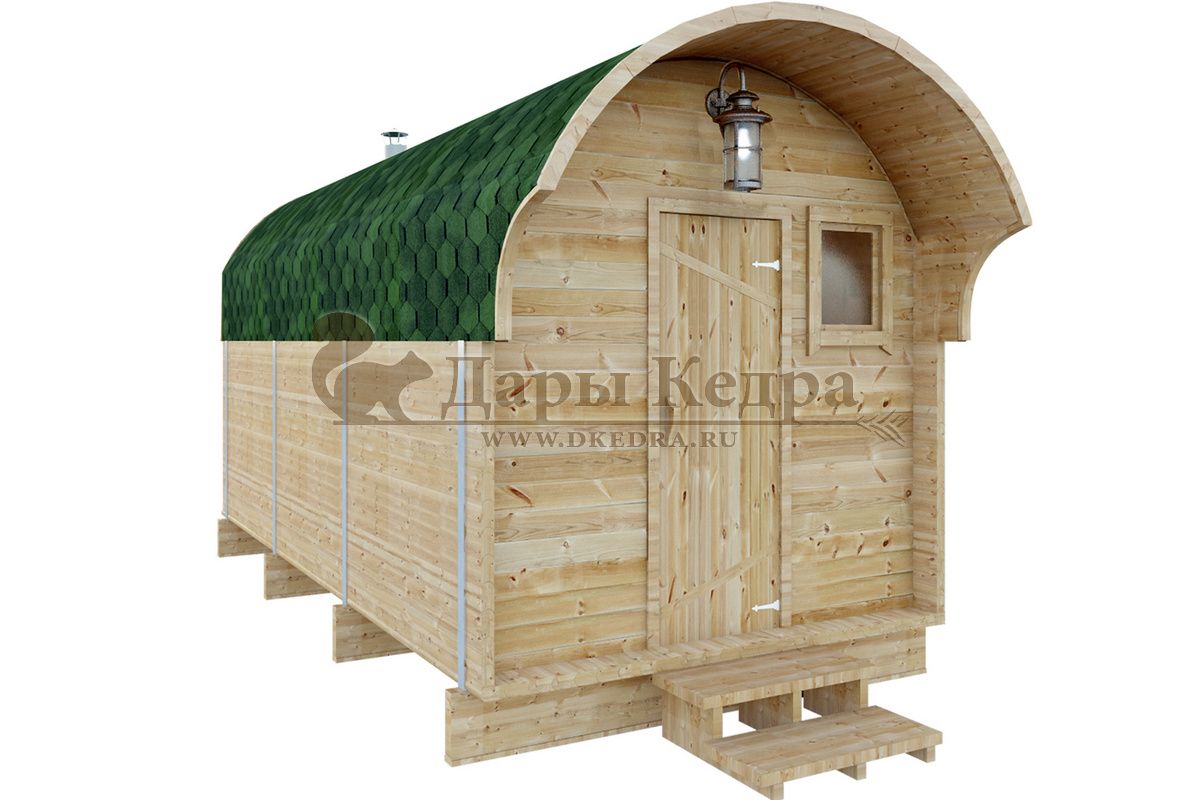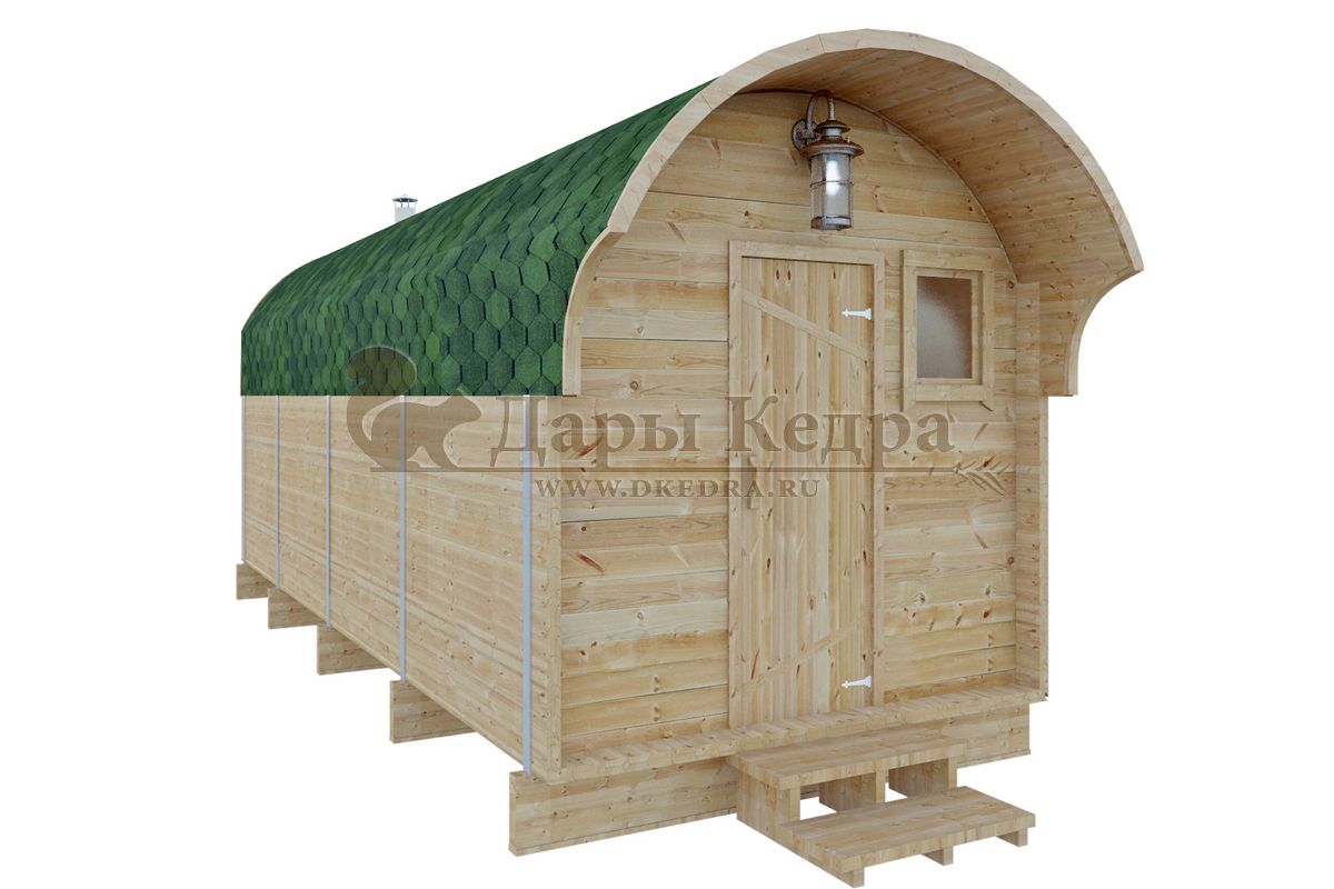 Симбиоз круглой и квадратной бани-бочки. Разработано с учётом эргономики, в ней так же просторно, как и в квадро-бочке, но при этом полукруглая крыша не дает задерживаться снегу и влаге на кровле. А еще такая баня безусловно красивая, мобильная и доступная каждому!