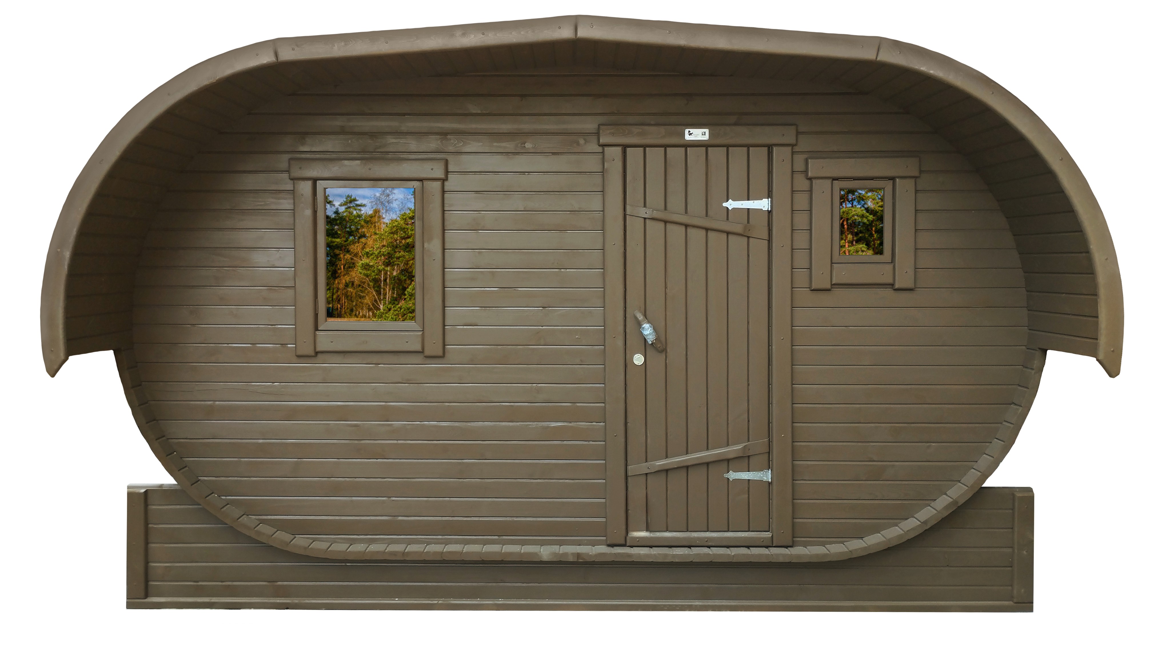 Баня-бочка «Орео» с боковым входом и панорамным окном Стильная и современная баня-бочка с боковым входом может быть выполнена длиною от 4 метров, что-бы было два отделения (парилка и комната отдыха). Полок может быть, как с двух сторон, так и угловой, в стандарте одноуровневый. Печь в данной модели расположена сбоку с топкой наружу, либо внутрь парилки. Печь можно укомплектовать баком для воды, а саму баню сделать длиною до 6 метров, комфортно разместив в ней дополнительно помывочную. В эту модель включено два закаленных стеклопакета: круглое и полукруг, которые мы можем разместить на ваше усмотрение в парилке и комнате отдыха. Обращаем Ваше внимание, по умолчанию в данной модели отсутствует бак для воды, вместо него идёт утеплённая термо-труба, которую можно заменить на бак по желанию.