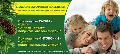 *Скидка 19% действует на все финские и инфракрасные сауны с керамическими нагревателями, скидка 9% действует на все инфракрасные сауны с карбоновыми нагревателями. При покупке любой инфракрасной сауны - дарим цветотерапию, при покупке финской сауны -  фирменный термометр. Акция действует до 10 апреля 2019 г.