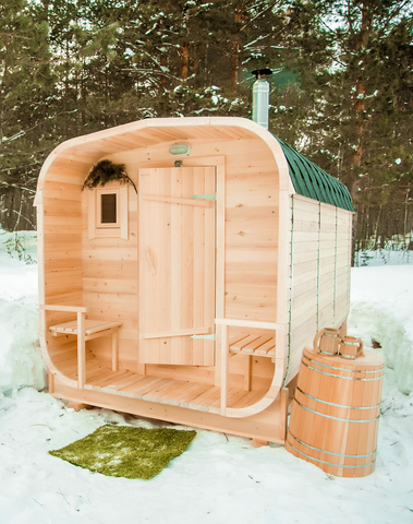 Баня-бочка буханка из кедра 3,5 метра Это более просторная модель за счет увеличенной высоты потолков и ровного пола. В такой модели раздевалка совмещена с моечной. Тут установлен душевой поддон, вешалка, полочка и лавочка из кедра. В парильном отделении по обе стороны расположены двухуровневые открытые полки, печь находится между ними у дальней стены. Время растопки такой бани не превышает 30 минут. По вашему желанию баню-бочку можно укомплектовать козырьком, верандой и печью с внешней загрузкой, благодаря которой весь мусор во время топки остается на улице. Баня-бочка буханка не требует полноценный фундамент, поэтому при необходимости ее можно перенести в другое место. Обращаем Ваше внимание, что в стандартную комплектацию бани входят полки открытого типа в парной с обеих сторон. Дополнительно можно заказать полок закрытого типа или лавку! Кедр обладает ароматическими свойствами. Он не деформируется и влагоустойчив, при правильном уходе за деревом на нем не развиваются грибки и плесень.