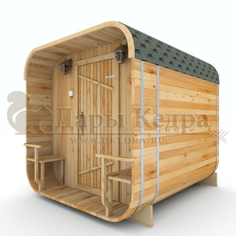 Баня-бочка квадро из кедра с верандой (все размеры) Это прямоугольное с закругленными углами. За счет такой конструкции во время топки воздух циркулирует по кругу, поэтому баня-бочка нагревается не более 30 минут. На веранде можно оставить вещи или отдохнуть после процедур парения. Лавочки из кедра находятся по всей длине бани-бочки с обеих сторон. Печь расположена в парилке около дальней стены. В зависимости от выбранного размера баня-бочка квадро с верандой имеет следующую комплектацию: Баня-бочка квадро 2,5 метра - парилка; Баня-бочка квадро 3,5 и 4,5 метра - раздевалка, парилка; Баня-бочка квадро 5,5 и 6 метров - раздевалка, парилка, моечная. По вашему желанию ее можно укомплектовать печью с внешней загрузкой, благодаря которой весь мусор вовремя топки остается на улице. Баня-бочка квадро не требует полноценный фундамент, поэтому при необходимости ее можно перенести в другое место. Обращаем Ваше внимание, что в стандартную комплектацию бани входят лавки в парной с обеих сторон. Дополнительно можно заказать полок открытого или закрытого типа! Кедр обладает ароматическими свойствами. Он не деформируется и влагоустойчив, при правильном уходе за деревом на нем не развиваются грибки и плесень. Обращаем Ваше внимание, что данную модель бани-бочки можно изготовить с ровным полом. Эта дополнительная опция и оплачивается отдельно!