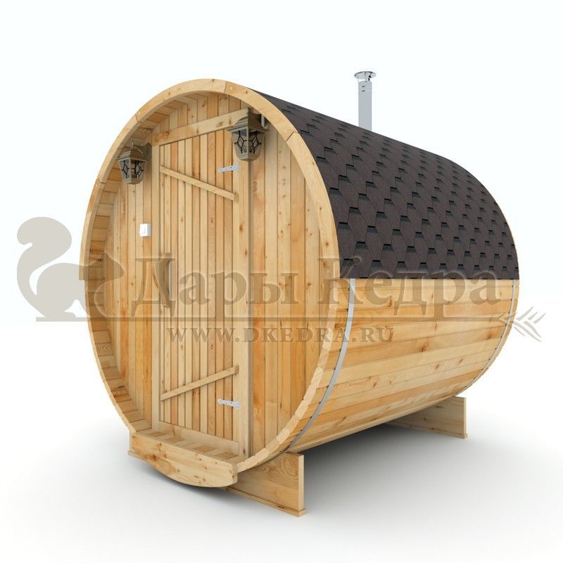 Баня-бочка круглая из кедра 3 метра Это изделие круглой вытянутой формы с двумя отделениями: раздевалкой и парной. Лавочки из кедра находятся по всей длине бани-бочки с обеих сторон. Печь расположена в парилке около дальней стены. Для удобства пользования в раздевалке установлена вешалка и полочка из кедра. За счет небольшой конструкции баня нагревается не более 30 минут. По вашему желанию баню-бочку можно дополнить печью с внешней загрузкой, благодаря которой весь мусор после топки останется на улице. Круглая баня-бочка не требует полноценный фундамент, поэтому при необходимости ее можно перенести в другое место. Обращаем Ваше внимание, что в стандартную комплектацию бани входят лавки в парной с обеих сторон. Дополнительно можно заказать полок открытого или закрытого типа! Кедр обладает ароматическими свойствами. Он не деформируется и влагоустойчив, при правильном уходе за деревом на нем не развиваются грибки и плесень.