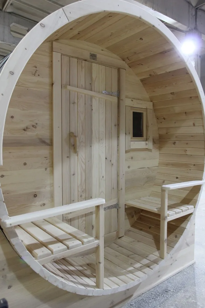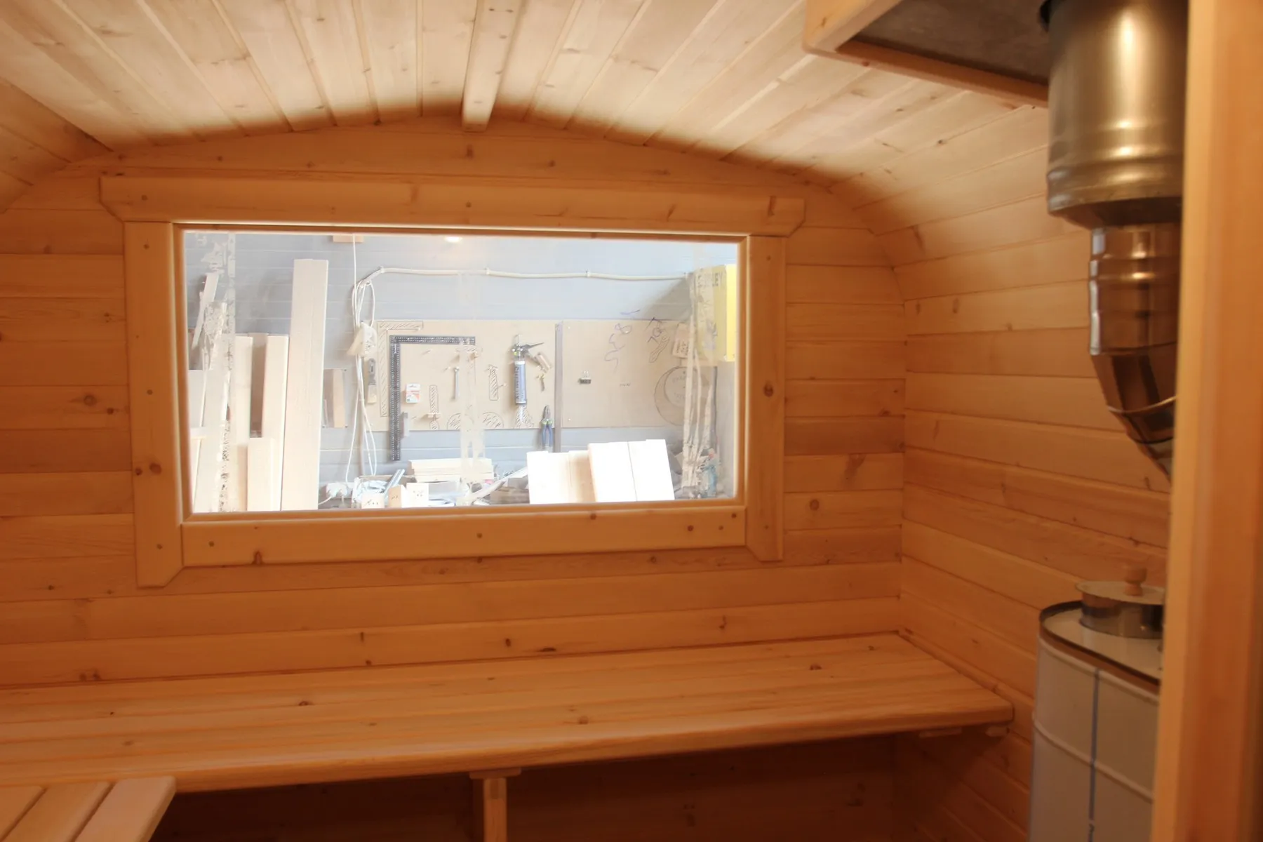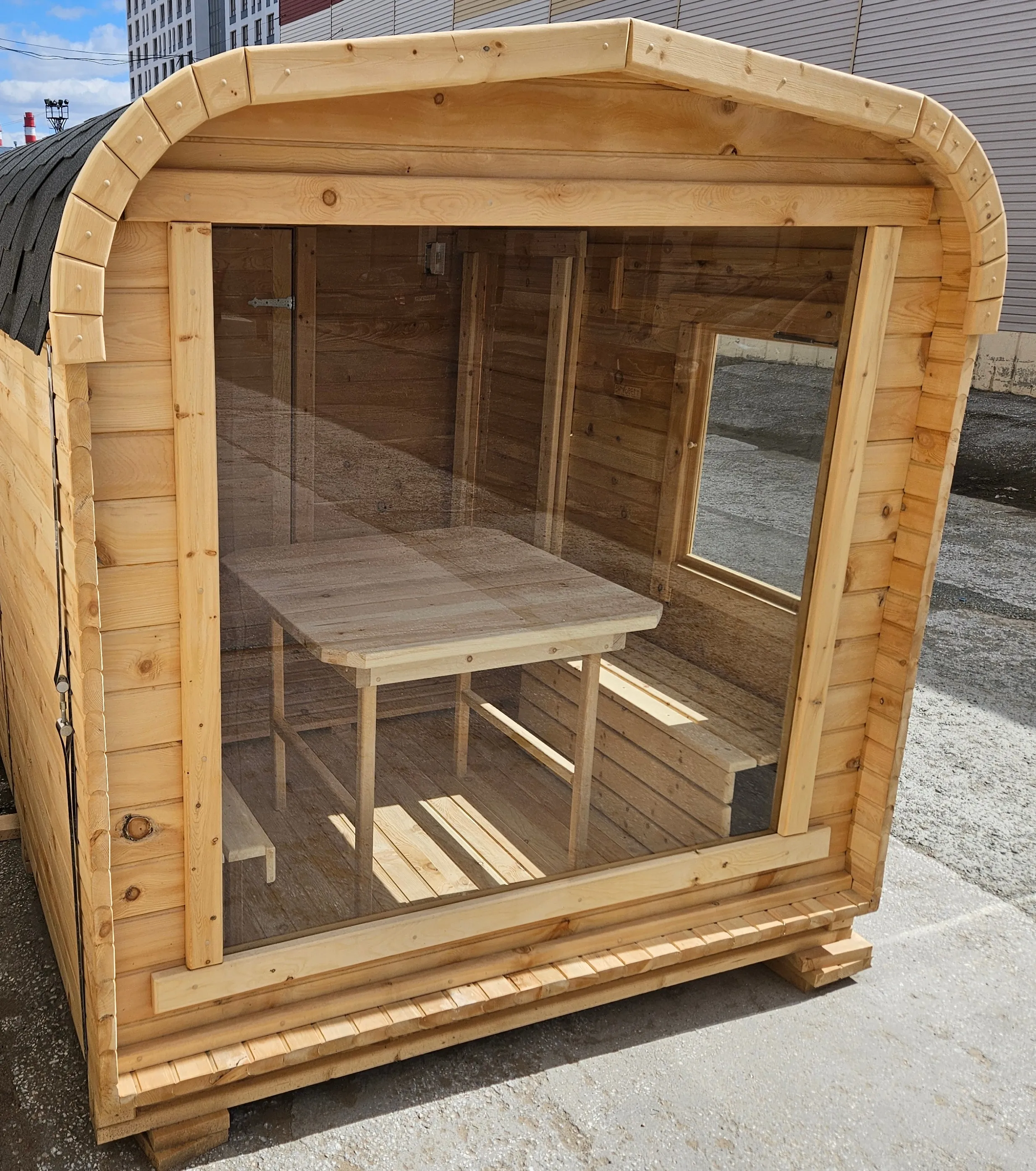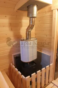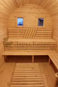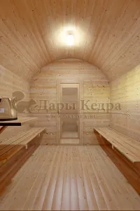 Баня-буханка более просторная за счет увеличенной высоты потолков и ровного пола. Козырек не только украшает баню, но и защищает оставленную обувь от дождя. Лавочки из кедра находятся по всей длине бани-бочки с обеих сторон. Печь расположена в парилке около дальней стены. Время растопки такой бани не превышает 30 минут. В зависимости от выбранного размера баня-бочка буханка с козырьком имеет следующую комплектацию: