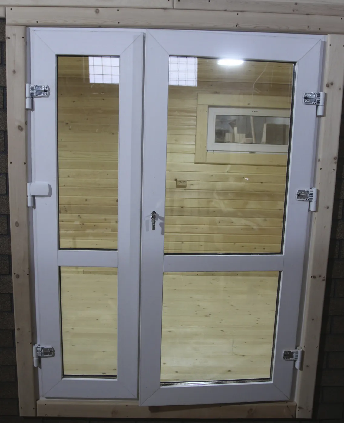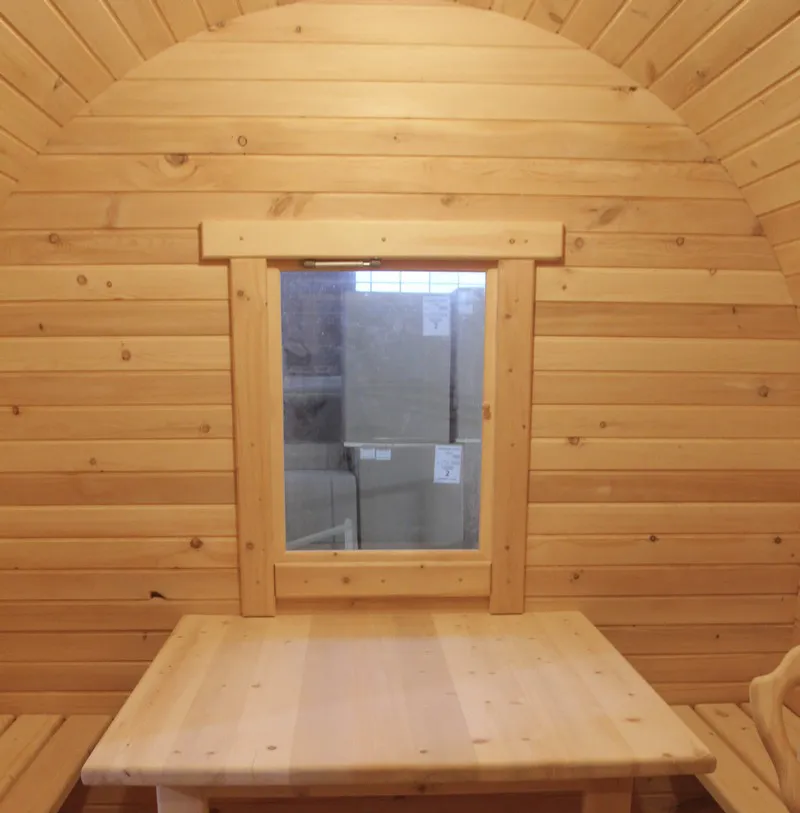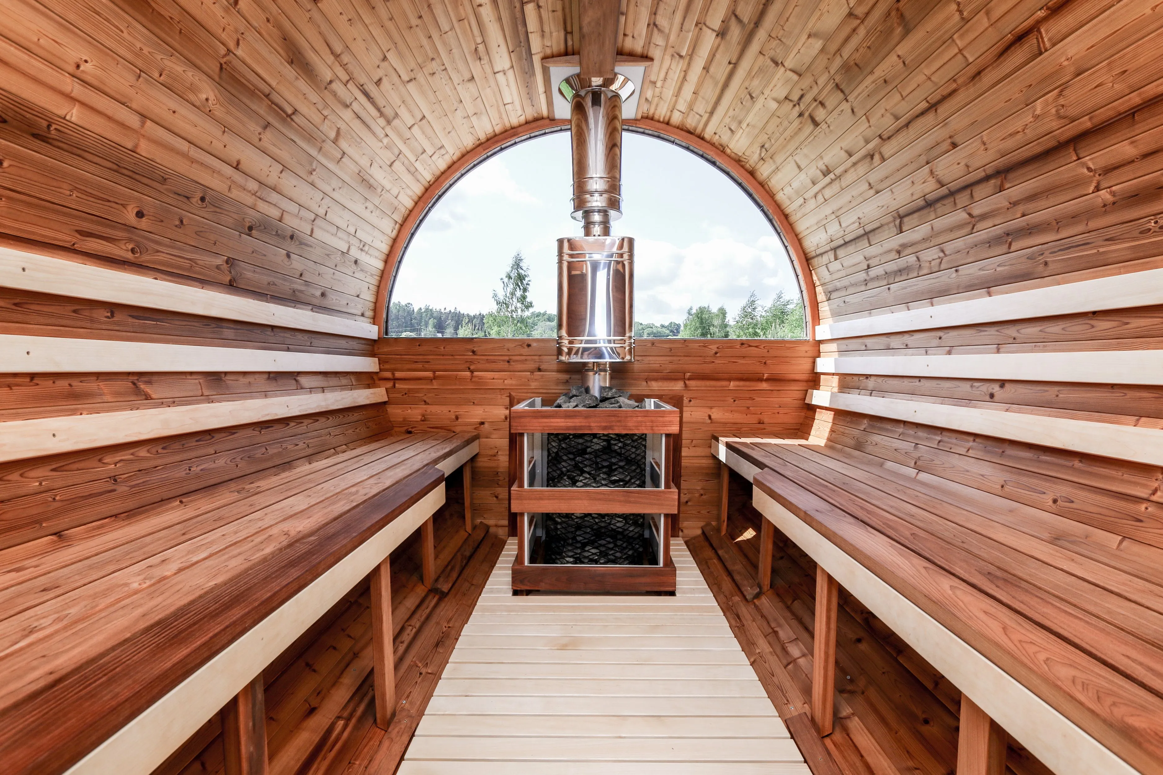 Баня-буханка более просторная за счет увеличенной высоты потолков и ровного пола. Козырек не только украшает баню, но и защищает оставленную обувь от дождя. Лавочки из кедра находятся по всей длине бани-бочки с обеих сторон. Печь расположена в парилке около дальней стены. Время растопки такой бани не превышает 30 минут. В зависимости от выбранного размера баня-бочка буханка с козырьком имеет следующую комплектацию: