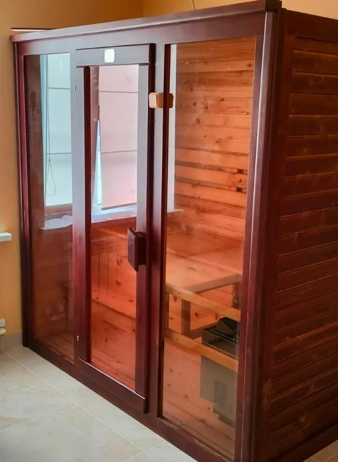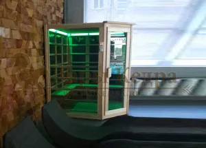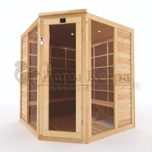Это специально оборудованная кедровая кабина для прогрева тела человека сухим теплом. Воздух в таких парных не нагревается. Инфракрасные лучи воздействуют на тело, равномерно прогревая мышцы, суставы и органы. Карбоновые излучатели, встроенные в стены кабины, обладают мягким прогревом, что полностью исключает возможность ожога. Работает кабина за счет электричества. Установка сауны в угол, позволяет рационально использовать пространство помещения. Подходит как для домашнего использования, так и для коммерции.