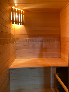 Это специально оборудованная готовая деревянная кабина для сухого и влажного парения. Электропечь нагревает пространство внутри и позволяет сбрызгивать камни водой, слегка увлажняя воздух. Такая процедура позволяет избежать перегрева. Каркас сауны выполнен из массива кедра, снаружи и внутри обшит липовой вагонкой сорта «Экстра» и имеет теплоизоляционный слой. Также двухуровневый полок идёт из кедра для обогащения внутри кабины полезными фитонцидами, а в сочетании с противовирусными свойствами липы сауна становится настоящим источником здоровья.