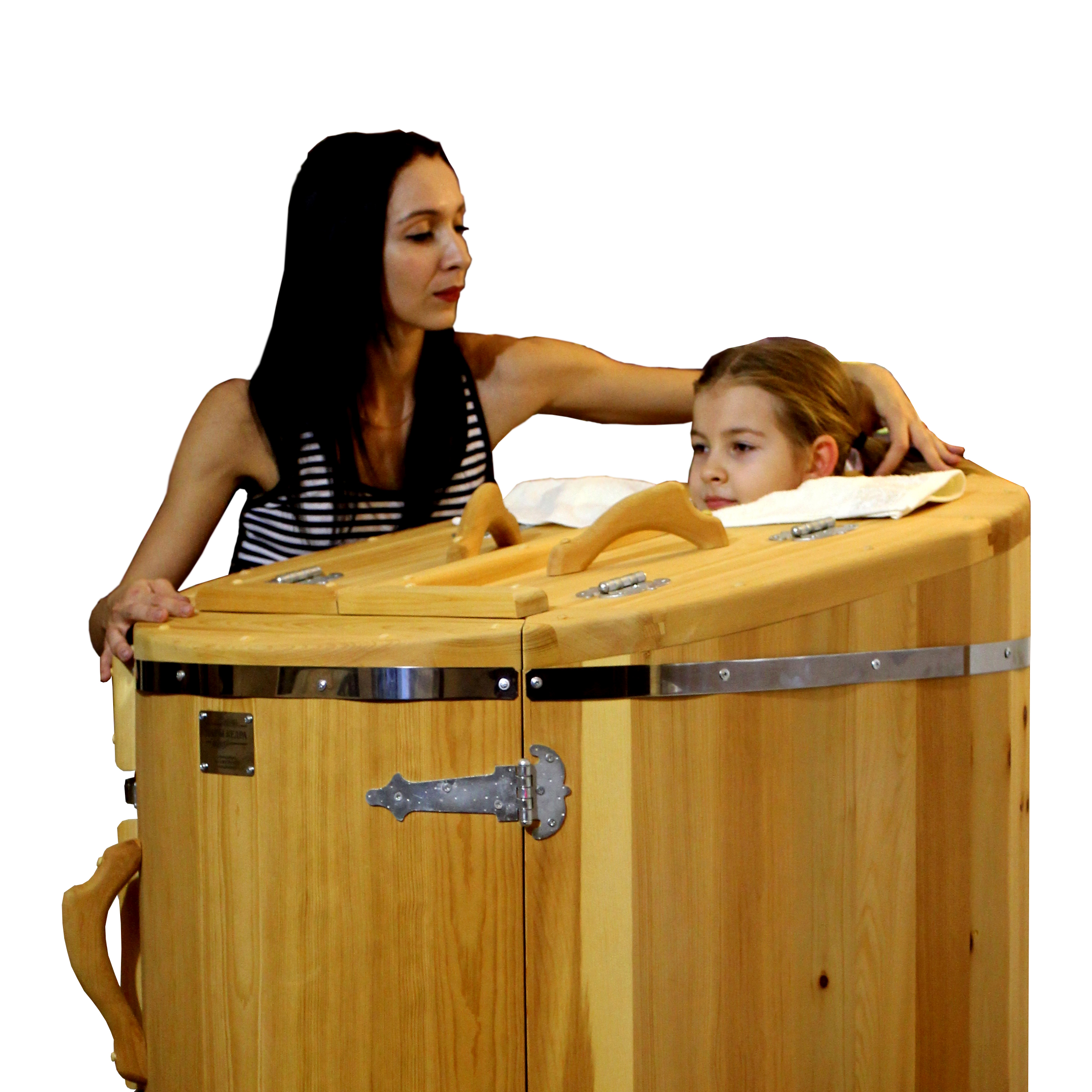 Двухместная фитобочка из кедра - это парная, в которой удобно принимать процедуры двум людям. Она оборудована откидными створками, дверцей, отверстием для головы и перегородкой (по желанию). Толщина стенок составляет 25 мм. Во время парения человек находится внутри кедровой бочки, а голова снаружи. Благодаря этому исключается возможность перегрева. Подлокотники из кедра и внутренние ручки делают эксплуатацию фитобочки более удобной.