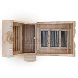 Квадратная двухрежимная фитобочка из кедра может быть использована как инфракрасная сауна и парная. Карбоновые излучатели отвечают за сухое парение, они находятся на внутренней стороне дверцы и задней стенке фитобочки. Влажное парение происходит за счет поступления горячего пара в фитобочку через паропровод. Толщина стенок составляет 40-45 мм, что позволяет увеличить срок службы изделия. Откидная дверь бочки во время открывания фиксируется внешней подставкой - опорой, которая в закрытом состоянии складывается и не занимает лишнее пространство. Во время парения человек сидит внутри кедровой бочки, а голова находится снаружи. Благодаря этому исключается возможность перегрева. Встроенная ручка на двери делают эксплуатацию фитобочки более удобной.
