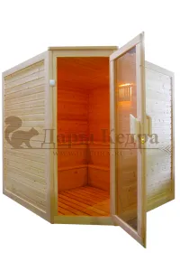Это специально оборудованная деревянная кабина для сухого и влажного парения. Электропечь нагревает пространство внутри и позволяет сбрызгивать камни водой, слегка увлажняя воздух. Такая процедура позволяет избежать перегрева. Двойные стенки кабины с теплоизоляционным материалом удерживают тепло. Установка сауны в угол позволяет рационально использовать пространство помещения. Финская сауна с электропечью подойдет, как для домашнего использования, так и для коммерции. Доставляется в разборном виде щитами, собирается по инструкции с помощью шуруповёрта.