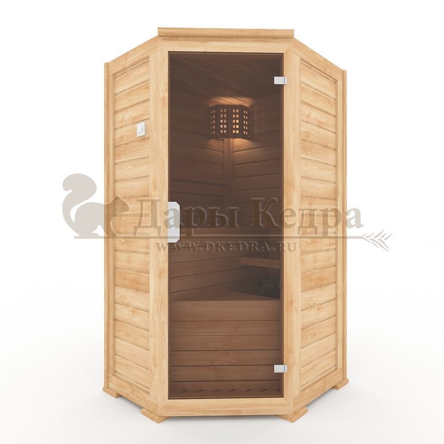 Одноместная угловая финская сауна кабина из кедра и липы с электрокаменкой Это специально оборудованная деревянная кабина для сухого и влажного парения. Электропечь нагревает пространство внутри и позволяет сбрызгивать камни водой, слегка увлажняя воздух. Такая процедура позволяет избежать перегрева. Сауна обшита снаружи и внутри вагонкой из липы и имеет теплоизоляционный слой. Установка сауны в угол позволяет рационально использовать пространство помещения. Финская сауна с электропечью подойдет как для домашнего использования, так и для коммерции. Доставляется в разборном виде щитами, собирается по инструкции с помощью шуруповёрта. Обращаем Ваше внимание, что в стоимость сауны уже включена дверь с закаленным стеклом в раме из кедра с фиксатором и деревянным фасадом. Вы можете заменить фасад на цельностеклянный с безрамной дверью за дополнительную плату