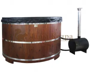 Это уличная подогреваемая купель с круглой внутренней чашей из термопластика. Для удобства пользования купель оборудована лавочками, приставной и внутренней лестницей. Подогрев воды осуществляется за счет внешней печи с дымоходом. Термопластик устойчив к воздействию температур, облегчает уход за фурако и увеличивает срок ее службы.