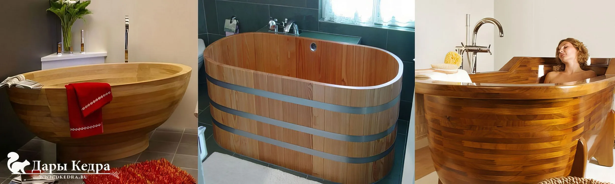 • Кедр не зря используют при судостроительстве. Древесина твёрдой породы отличается красивой структурой и благородным оттенком. Она не подвержена гниению, выдерживает долгое воздействие влаги и температуры. Практически не даёт усадки, не коробится и не трескается. Поэтому ванна при правильном уходе прослужит вам много лет.