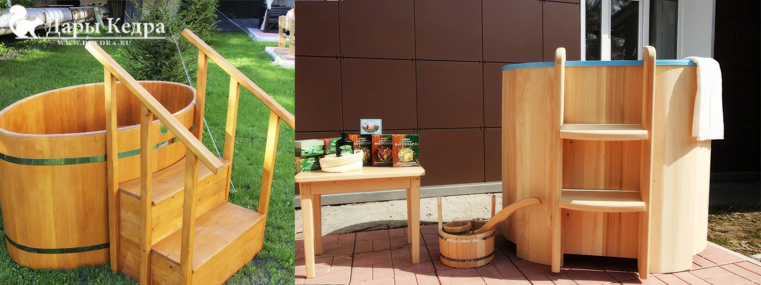 Сдвоенные бочки могут использоваться для контрастных процедур. В одну наливают холодную воду, в другую тёплую. По подиуму между ними удобно перемещаться. Занимают много места, поэтому чаще всего их используют для установки в SPA-салонах и банных комплексах.